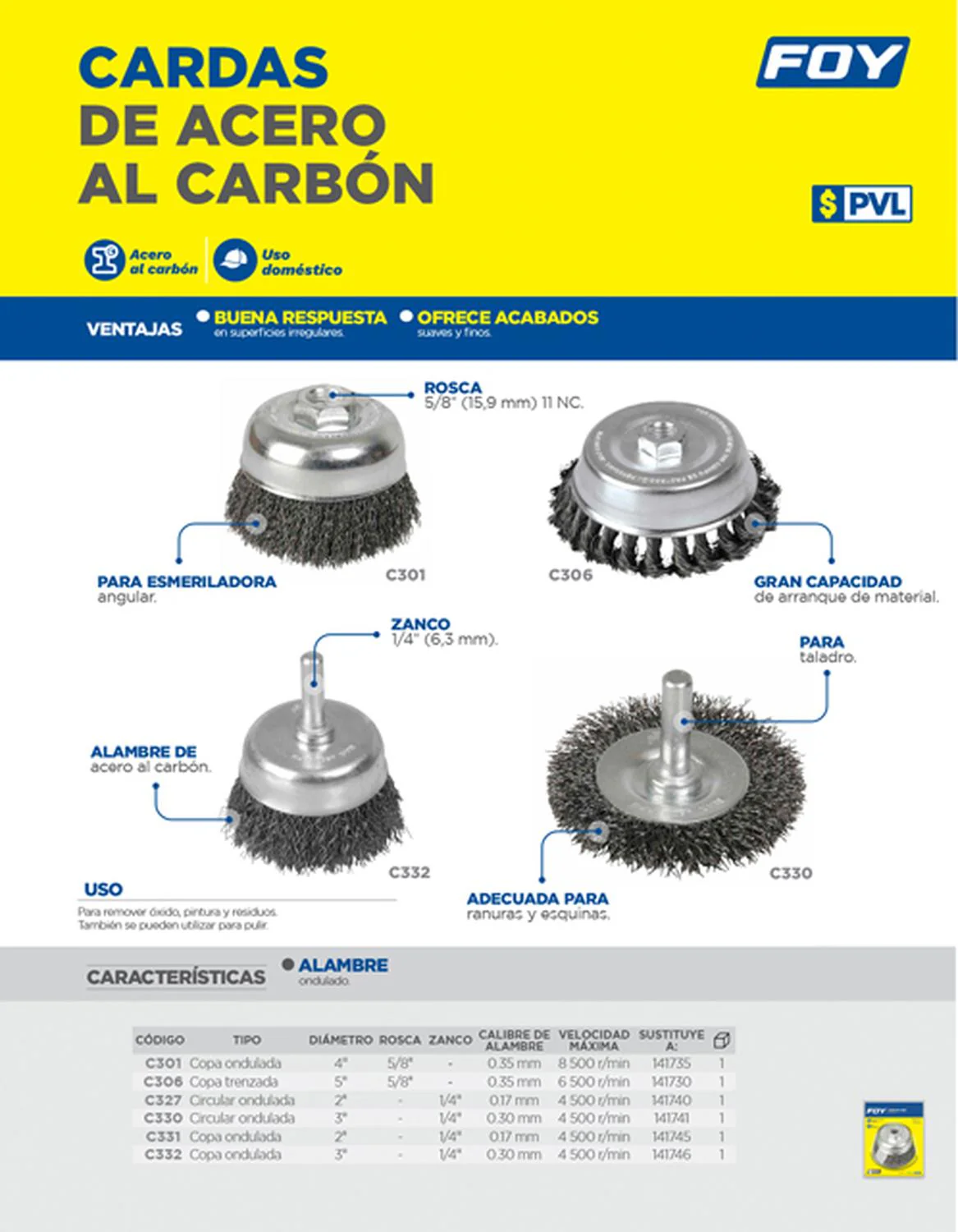 -Tipo de carda: Copa. Tipo de alambre: Ondulado. Diámetro de la carda: 3″. Velocidad máxima: 4500.