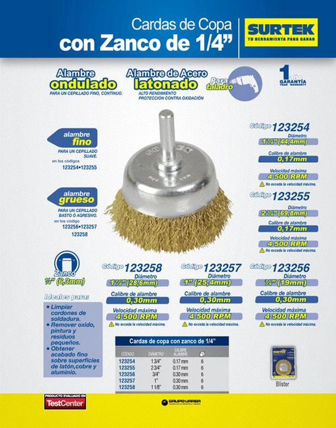 MARCA: Surtek DESCRIPCION DEL PRODUCTO: -Carda de copa con zanco de 1/4″1-3/4″x.17mm Surtek-Max. 4,500 rpm-Alambre ondulado de acero alto carbono-Cerdas con acabado latonado-Calibre alambre 0.17 mm ESPECIFICACIONES TECNICAS: -Diámetro: 1 3/4″-Normas: Iec-60136-Tipo De Alambre: Carbono/Ondulado CONTENIDO DEL PAQUETE: carda GARANTIA: Sin garantía ALTO EN CM: 7 LARGO EN CM: 14 FONDO EN CM: 10 PESO EN KG: 0.096