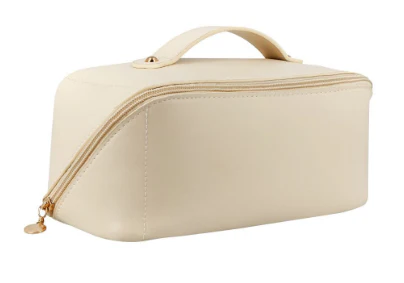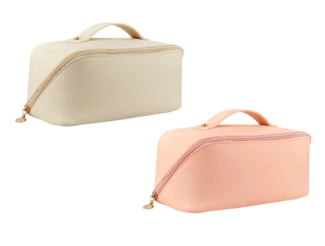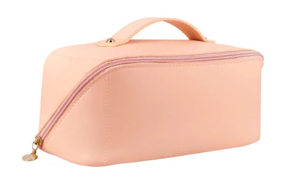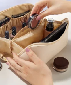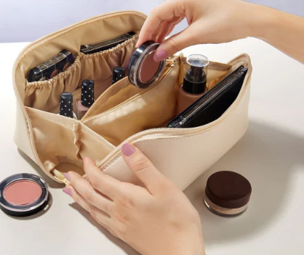 Su elegante diseño en curpiel agrega un toque de sofisticación a tu rutina diaria, su cierre cruzado permite expandir la cosmetiquera al abrir, brindándote un fácil acceso a tus productos. En su interior, encontrarás tres elásticos organizadores que mantienen tus artículos en su lugar, evitando que se mezclen. Además, cuenta con un bolsillo central con cierre, ideal para guardar objetos más pequeños. Incluye un asa del mismo material, lo que facilita su transporte. Podrás llevar tus productos esenciales de belleza de manera ordenada, ya sea en casa o en tus viajes.