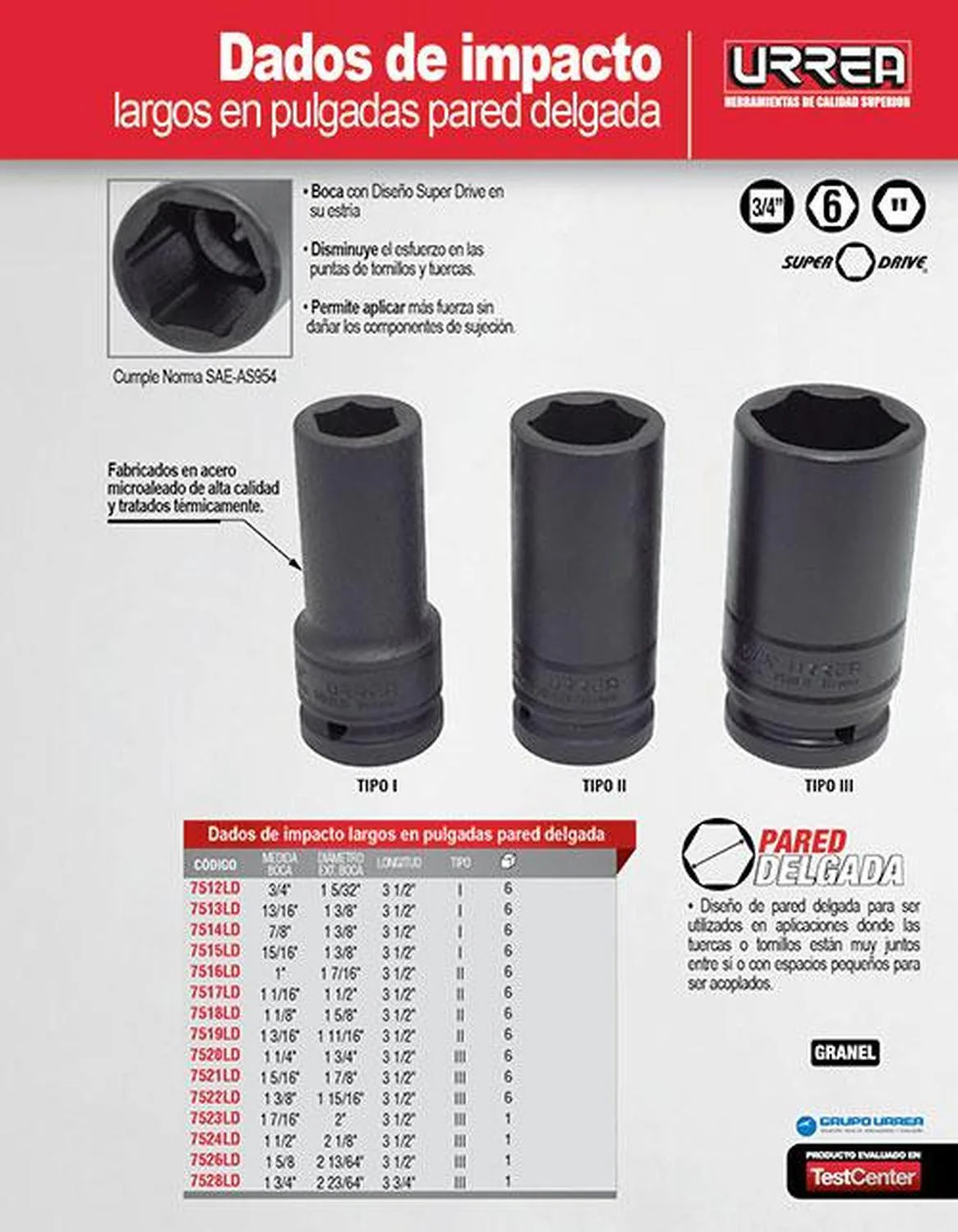 MARCA: Urrea DESCRIPCION DEL PRODUCTO: -Juego de dados largos Urrea de impacto cuadro 3/4″ estándar 6 puntas geometría lobular, acabado fosfatado-Cuenta con diseño de pared delgada para ser utilizados en aplicaciones donde las tuercas o tornillos están muy juntos entre si o con espacios pequeños para ser acoplados-Medida boca 1 7/16″-Tipo lll ESPECIFICACIONES TECNICAS: -Longitud: 3 1/2″-Medida: 1-7/16″-Sae O Métrico: Sae-Tamaño De Impulsor: 3/4″-Tipo De Dado: Iii-Tipo De Impulsión: Cuadrado CONTENIDO DEL PAQUETE: Dado GARANTIA: 1 año ALTO EN CM: 9 LARGO EN CM: 5 FONDO EN CM: 5 PESO EN KG: 0.69