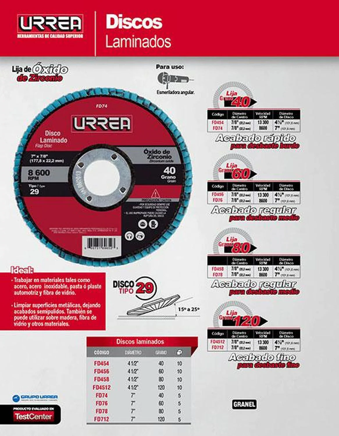 MARCA: Urrea DESCRIPCION DEL PRODUCTO: -Lija de oxido de zirconio-Disco tipo 29 15 a 25°-Resultado óptimo en lijado húmedo y seco. Grano de carburo de silicio ESPECIFICACIONES TECNICAS: -Centro: 7/8″-Disco: Tipo 29-Grano: 80-Uso: Desbaste Medio-Velocidad Máxima: 13300 Rpm-Precio De Venta Libre: Si CONTENIDO DEL PAQUETE: Disco laminado 4-1/2″ grano 80. GARANTIA: ALTO EN CM: 1 LARGO EN CM: 0.1 FONDO EN CM: 11.2 PESO EN KG: 0.068