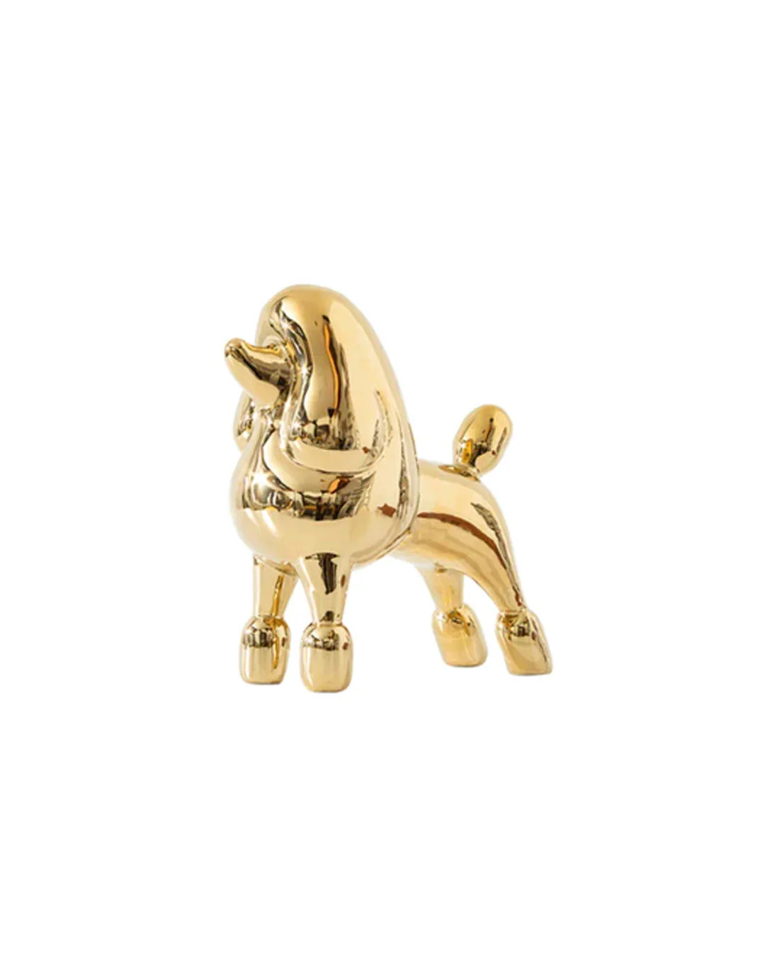 Adorno escultura en forma de perro color dorado y plateado hecho de cerámica. Brinda gracia a tu casa. Es combinable con todo.