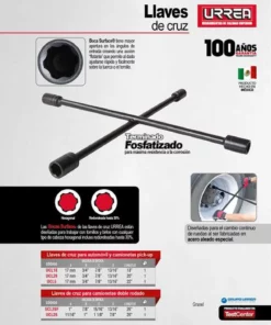 MARCA: Urrea DESCRIPCION DEL PRODUCTO: -Llave de cruz 17 mm x 3/4″ x 7/8″ x 33/16″ x 20″-Boca Surface, tiene mayor apertura en los ángulos de entrada creando una acción flotante que permite al dado ajustarse rápida y fácilmente sobre la tuerca o el tornillo-Ideal para comprensor alineamientos imperfectos entre la herramienta y el brillo-Diseñados para el cambio masivo de ruedas al ser fabricadas en acero aleado ESPECIFICACIONES TECNICAS: -Boca “A”: 17Mm-Boca “B”: 3/4″-Boca “C”: 7/8″-Boca “D”: 13/16″-Longitud: 20″ CONTENIDO DEL PAQUETE: llave de cruz GARANTIA: 1 año ALTO EN CM: 3 LARGO EN CM: 50.5 FONDO EN CM: 50.5 PESO EN KG: 2.331
