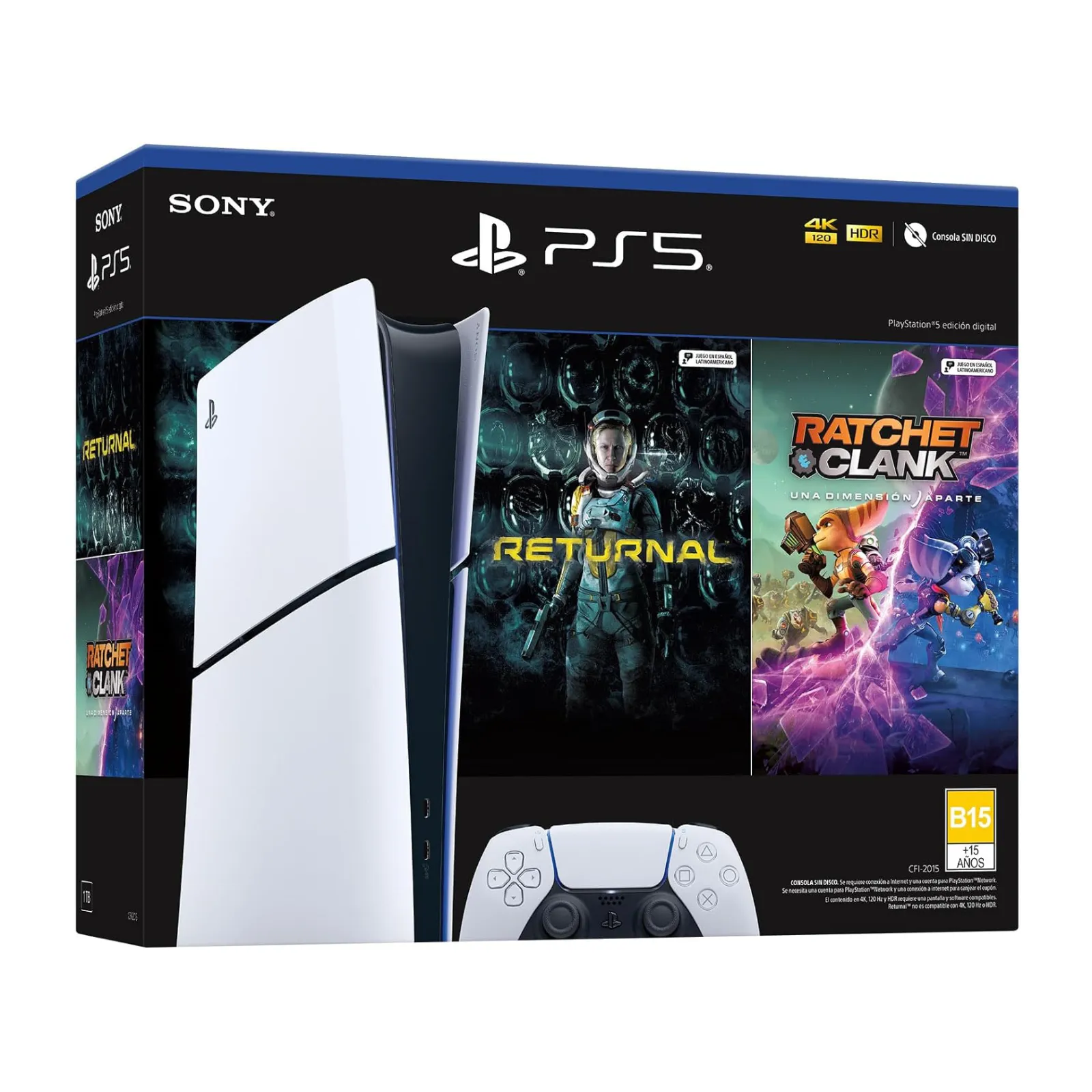 Este paquete de gran valor incluye dos juegos aclamados por la crítica de PlayStation Studios; Ratchet & Clank: Rift Apart y Returnal Una versión completamente digital de la consola PS5 que no trae unidad de disco. Inicia sesión en tu cuenta de PlayStation Network y ve a PlayStation Store para comprar y descargar juegos digitales de PS5 y PS4.
