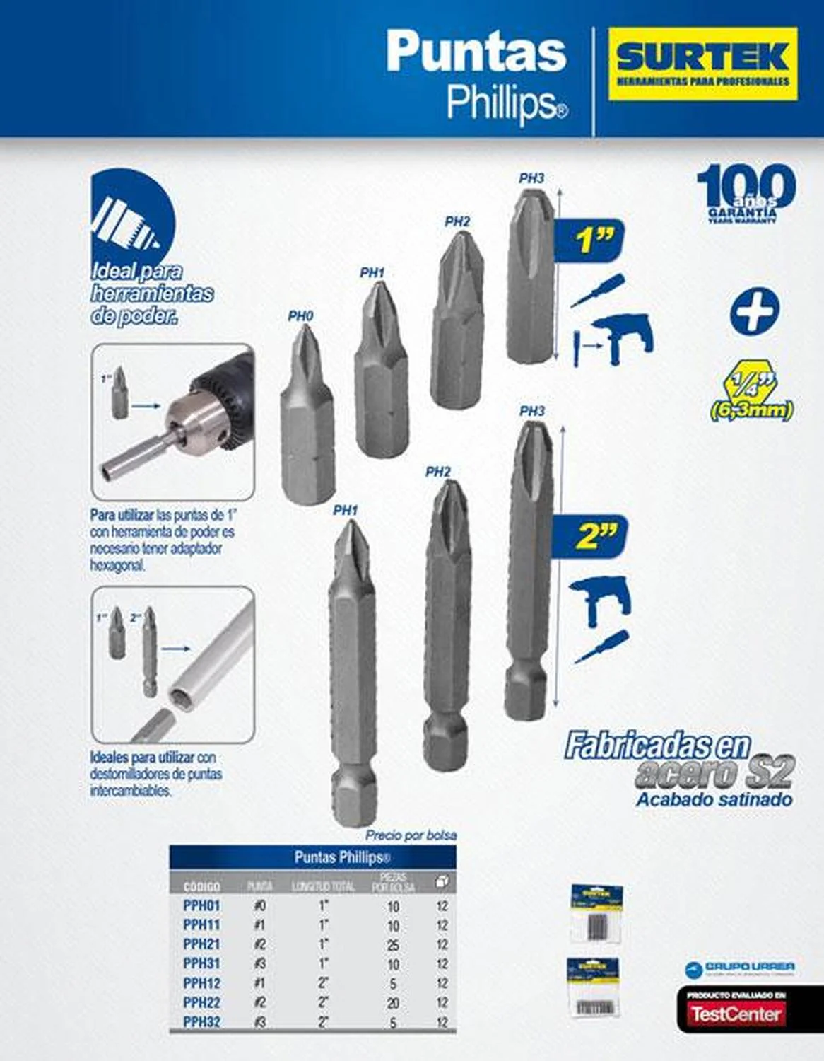 MARCA: Surtek DESCRIPCION DEL PRODUCTO: -Fabricadas en acero S2 acabado satinado-Para utilizar las puntas de 1″ con herramienta de poder es necesario tener adaptador hexagonal-Punta Phillips ESPECIFICACIONES TECNICAS: -Longitud Total: 2″-Vástago: Hexagonal 1/4″-Tamaño De Punta: No. 3-Tipo De Punta: Phillips CONTENIDO DEL PAQUETE: punta Phillips GARANTIA: 1 año ALTO EN CM: 0.5 LARGO EN CM: 12 FONDO EN CM: 10 PESO EN KG: 0.061