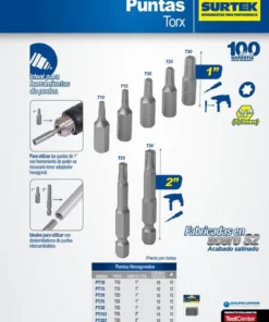 MARCA: Surtek DESCRIPCION DEL PRODUCTO: -Fabricadas en acero S2 acabado satinado-Para utilizar las puntas 1″ con herramienta de poder es necesario tener adaptador hexagonal ESPECIFICACIONES TECNICAS: -Longitud Total: 2″-Vástago: Hexagonal 1/4″-Tamaño De Punta: T25-Tipo De Punta: Torx CONTENIDO DEL PAQUETE: punta torx GARANTIA: 1 año ALTO EN CM: 0.5 LARGO EN CM: 12 FONDO EN CM: 10 PESO EN KG: 0.101