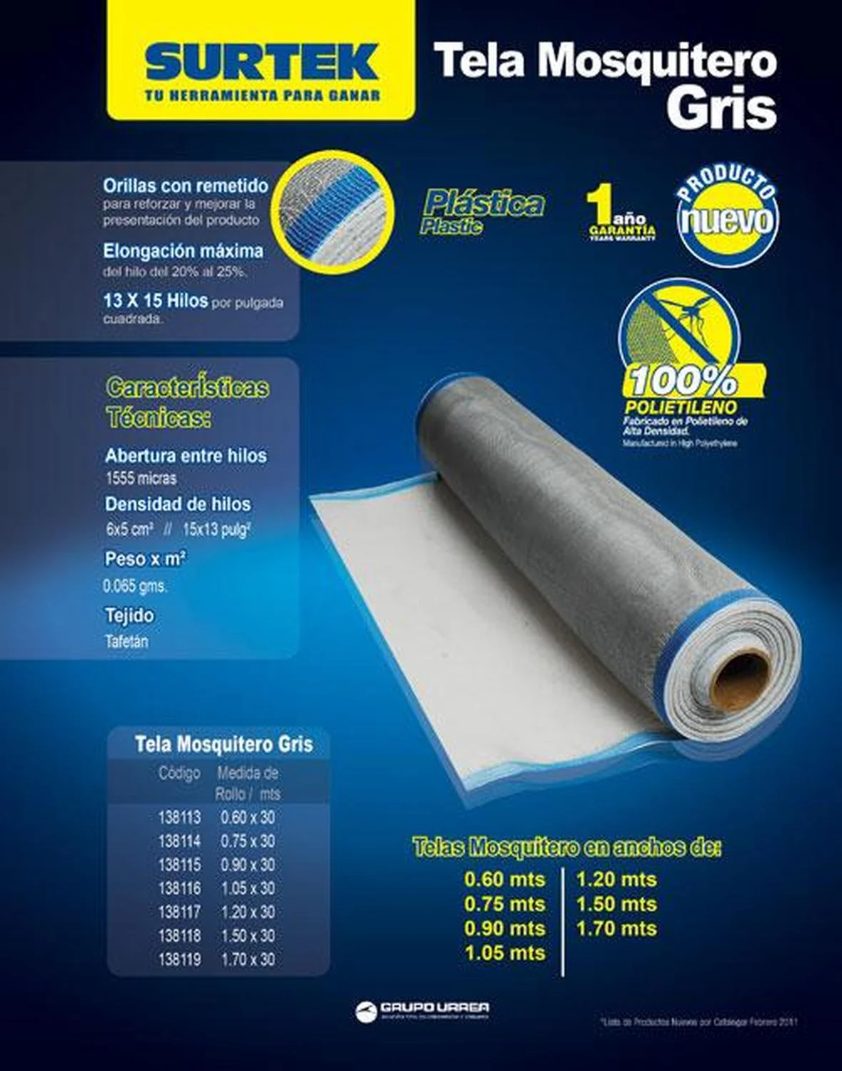 MARCA: Surtek DESCRIPCION DEL PRODUCTO: -100% polietileno de alta densidad-Orillas con remetido para reforzar y mejorar la presentación del producto-Elongación máxima del hilo del 20 al 25%-Peso por m2 0.065 kg-Tejido tipo tafetán ESPECIFICACIONES TECNICAS: -Ancho: 1.2 M-Color: Verde-Diámetro De Hilo: 0.20 Mm-Longitud: 30 M-Material: Polietileno 100%-Tramada (Hilos): 13X15 H/Pulg2 CONTENIDO DEL PAQUETE: tela para mosquitero GARANTIA: ALTO EN CM: 14 LARGO EN CM: 128 FONDO EN CM: 14 PESO EN KG: 3.15