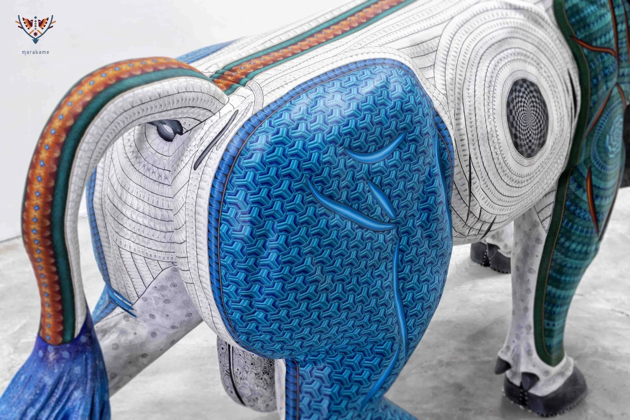 El color azul cubre su frente y lomo, dándole por cubierta el color de las noches estrelladas. El blanco es un lienzo claro sobre el que se manifiestan las finas líneas del pincel, haciendo que la piel se asemeje a un textil detallado y precioso. El verde finalmente aporta la entereza y profundidad de su musculatura, adornada con símbolos que provienen de las antiguas sabidurías zapotecas, presentes en códices y edificios mesoamericanos.