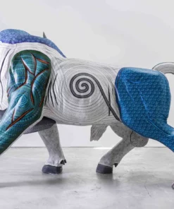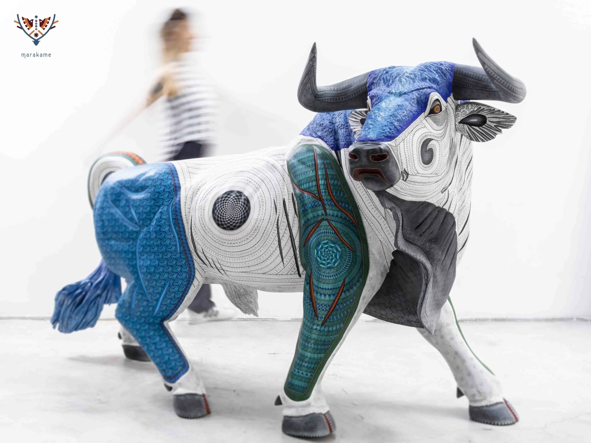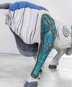 Desde 2017, en Marakame llevamos a cabo la dirección creativa de figuras zapotecas —cuyo nombre originario es “tonas” o “nahuales”—, comisionadas a los mejores autores de alebrije contemporáneo. El Toro de Lidia Imperial es una obra colectiva que se talló en madera de cedro y fue pintada a mano durante 11 meses. Pero es gracias a un proceso de 4 años que ha sido posible, pues las diferentes etapas que requirió —incluyendo el tallado, secado, decorado y sellado— se cuidaron de manera cuidadosa y cercana. Por ello se trata de un “Tona” irrepetible y excepcional, algo difícil de hallar.